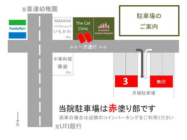 車・自転車などで来院 | 「平野本町5」交差点を南に進み、「ファミリーマート」さん「YAMAHAいちかわ」さんの交差点を西方向に曲がってすぐ。「The Cat Clinic」前に2台、病院斜め向かいの月極駐車場に2台あり。 |